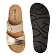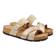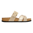 En stilfuld og komfortabel sandal med et moderne tvist. Easys No91 kombinerer funktionalitet og elegance med sit smukke mix af beige ruskind og metalliske guldremme. Den justerbare rem med guldfarvet spænde giver både god pasform og et eksklusivt udtryk.
