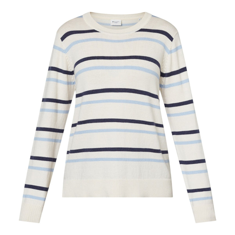 Denne striktrøje kombinerer klassisk maritim inspiration med blød komfort. Designet er holdt enkelt med et tidløst stribemønster i blå nuancer på en lys bund, som giver et frisk og afslappet udtryk. Den runde halsudskæring og de lange ærmer gør den nem at style til både hverdag og fritid, og den fine strik sikrer en behagelig pasform med let bevægelighed.