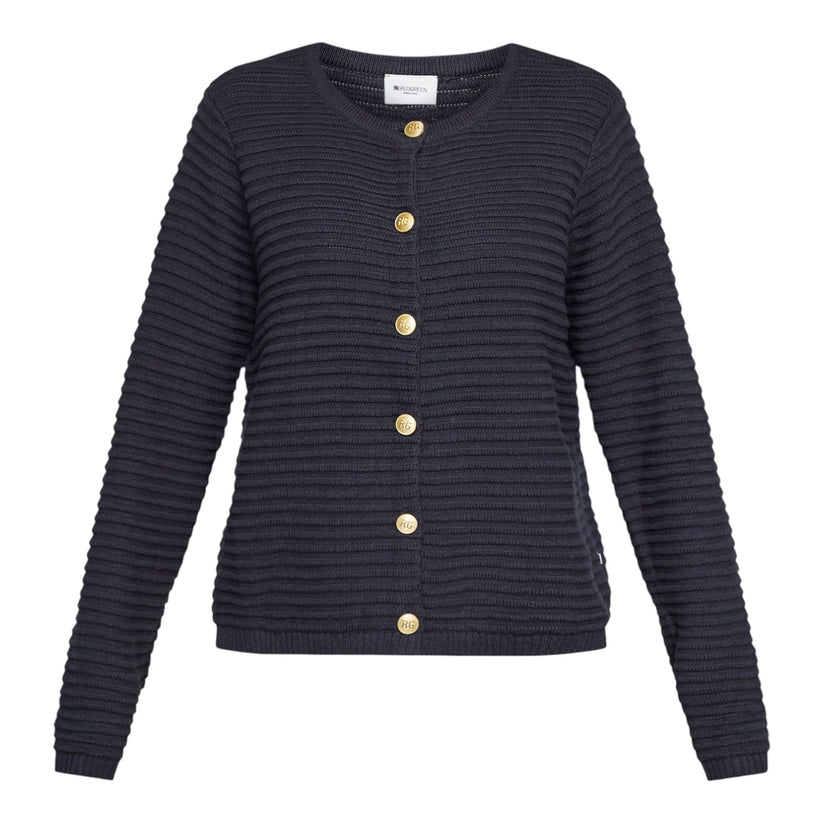 Elegant og klassisk cardigan i 100% økologisk bomuld. Den ribstrikkede struktur giver et flot og eksklusivt udtryk, mens de gyldne knapper foran tilføjer et feminint og sofistikeret touch. Den runde hals og lige pasform gør den ideel til både hverdag og arbejde.