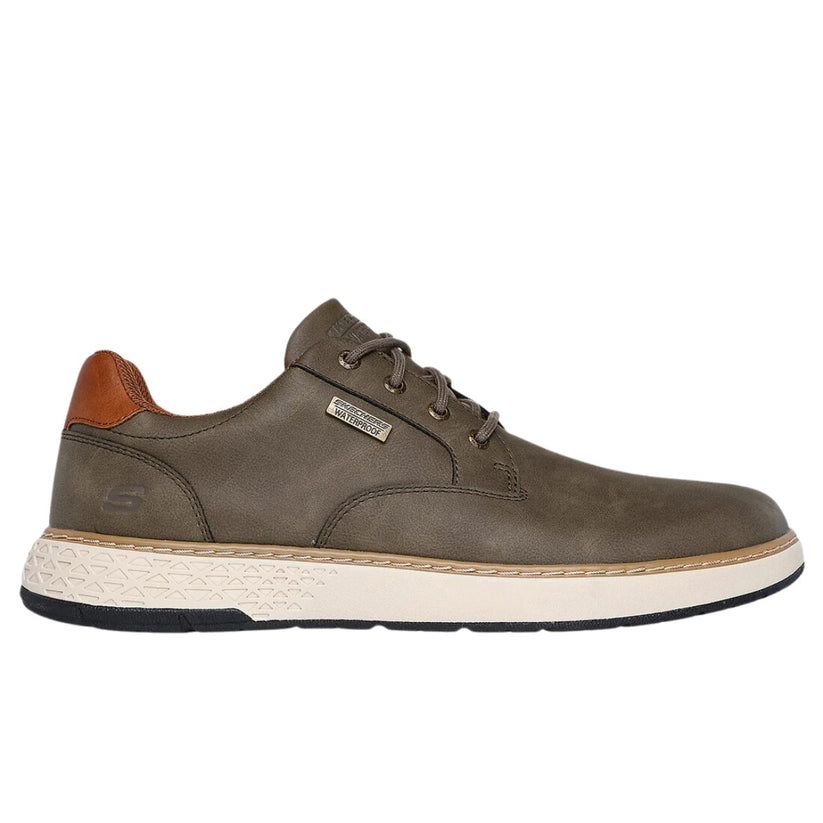 Klassisk stil og komfort mødes i Skechers Relaxed Fit: Garlan - Pryor. Denne model har en vandtæt snøre-overdel i vegansk læder med en kul infunderet Air-Cooled Memory Foam indersål og Skechers Goga Mat Arch polstring for ekstra støtte.