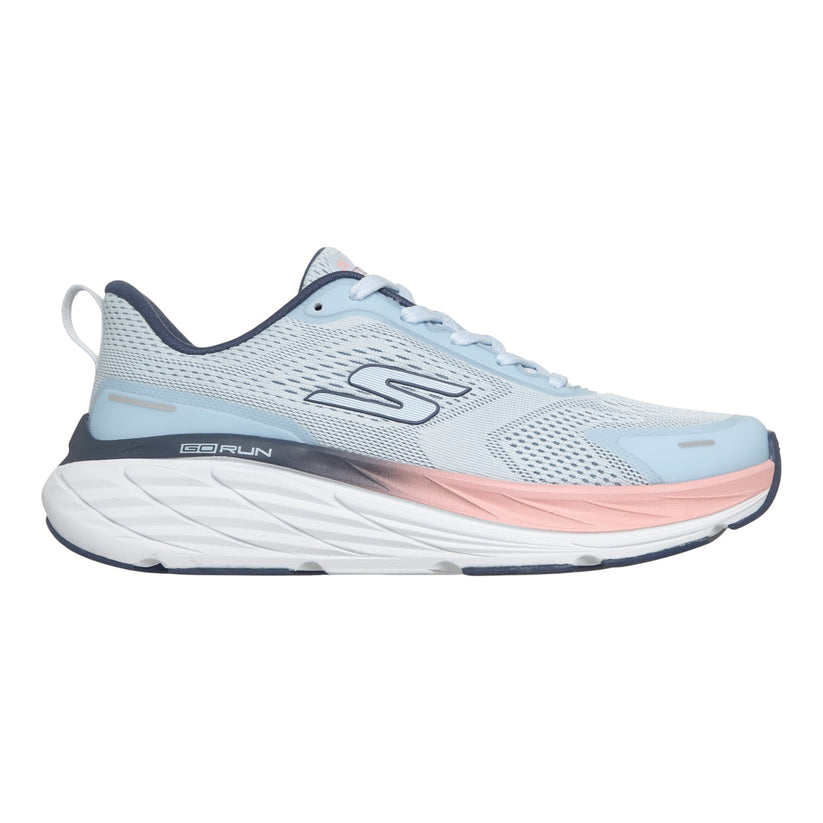 Denne Skechers W Max Cushioning Elite 3 sko i blå nuancer er designet med en robust sål, der giver et solidt fundament. Den lyseblå overdel med mørkeblå og lyserøde detaljer skaber et stilrent og moderne udtryk, der passer til forskellige aktiviteter.