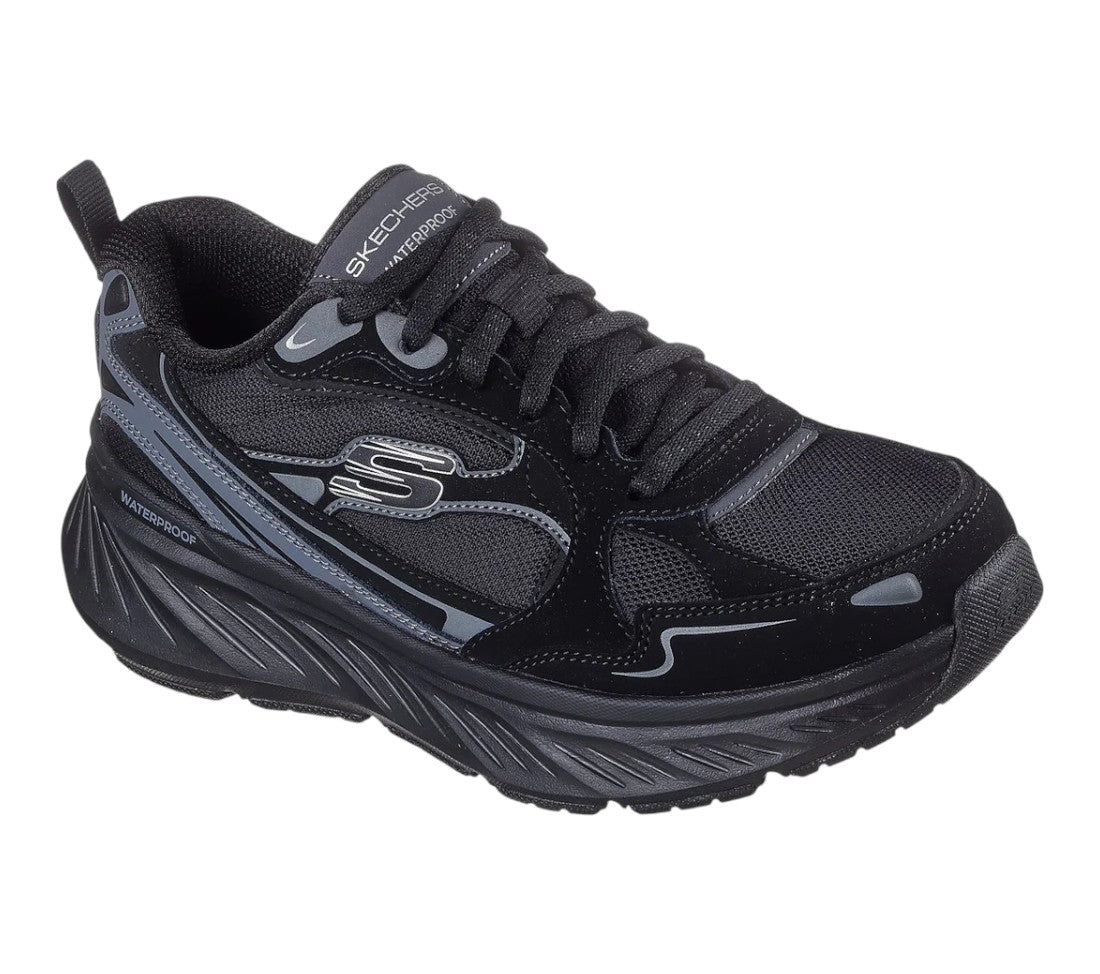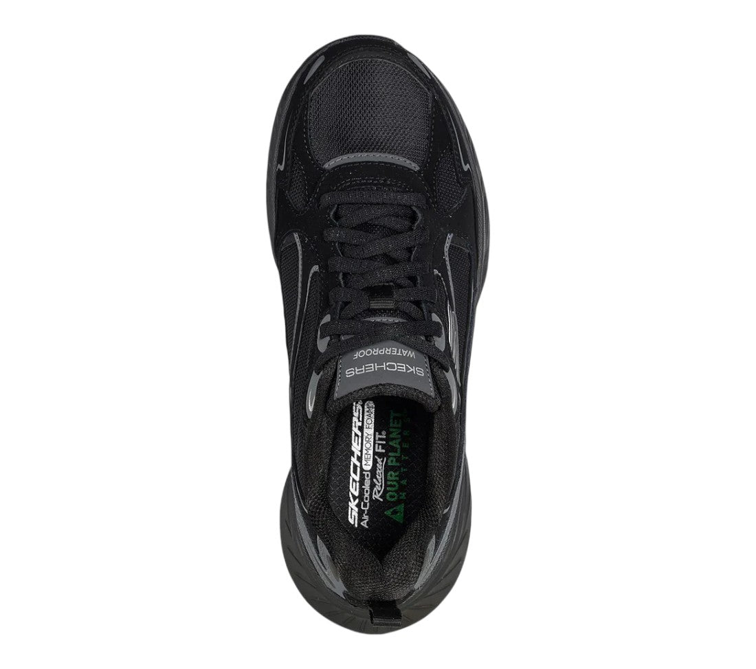 Hold dig tør i Skechers Relaxed Fit®: Edgeride - Misty Skies. Denne sko er 100% vandtæt og designet med genbrugsmaterialer. Den har en overdel i mesh, duraleather og ægte læder, en veldæmpet mellemsål og en Skechers Air-Cooled Memory Foam® indersål. Denne sko er en del af Our Planet Matters®: Good for your feet. Good for the world.®