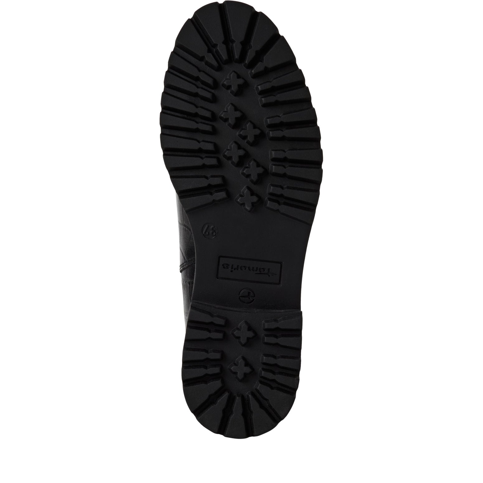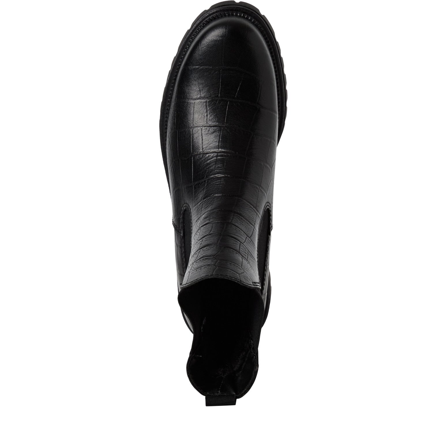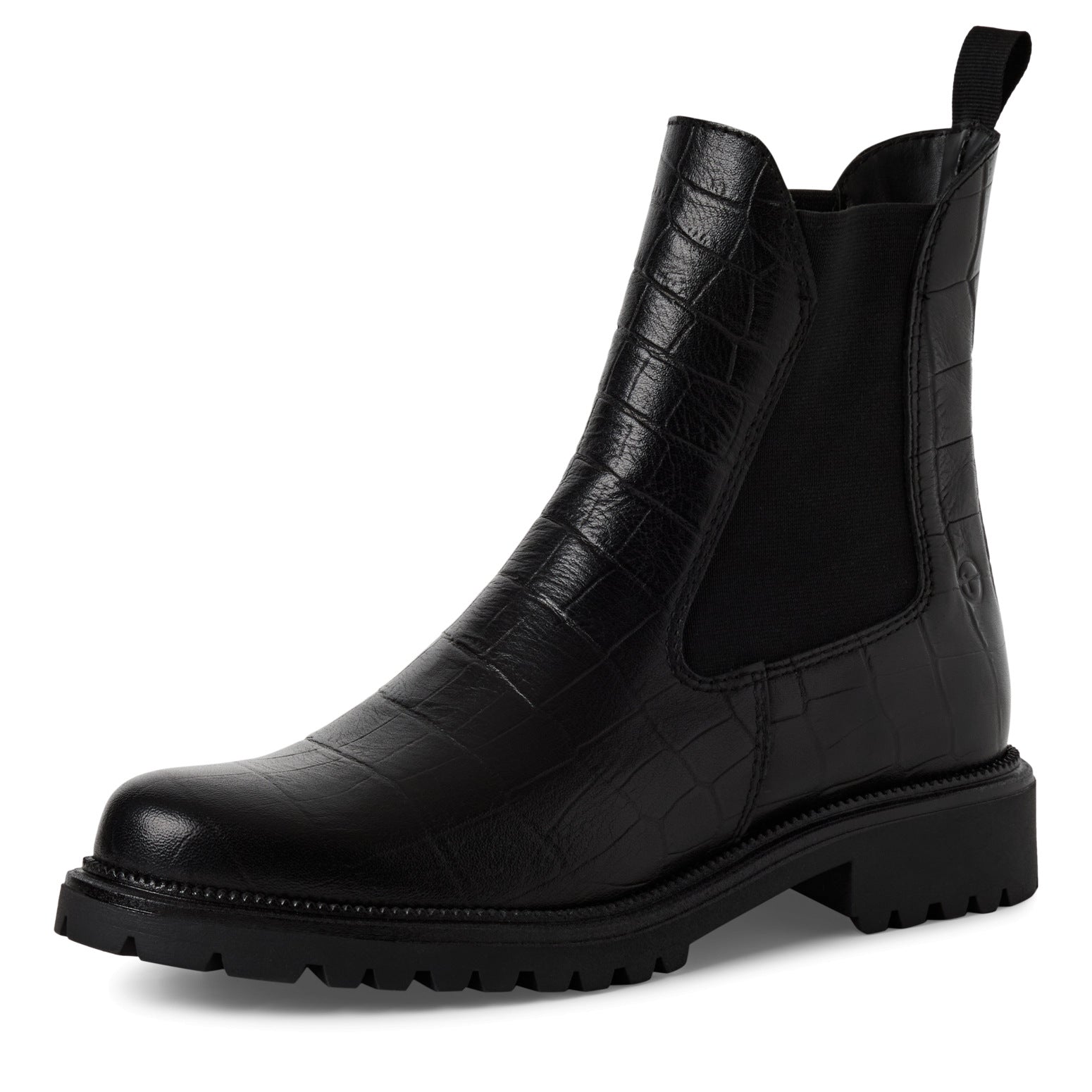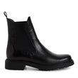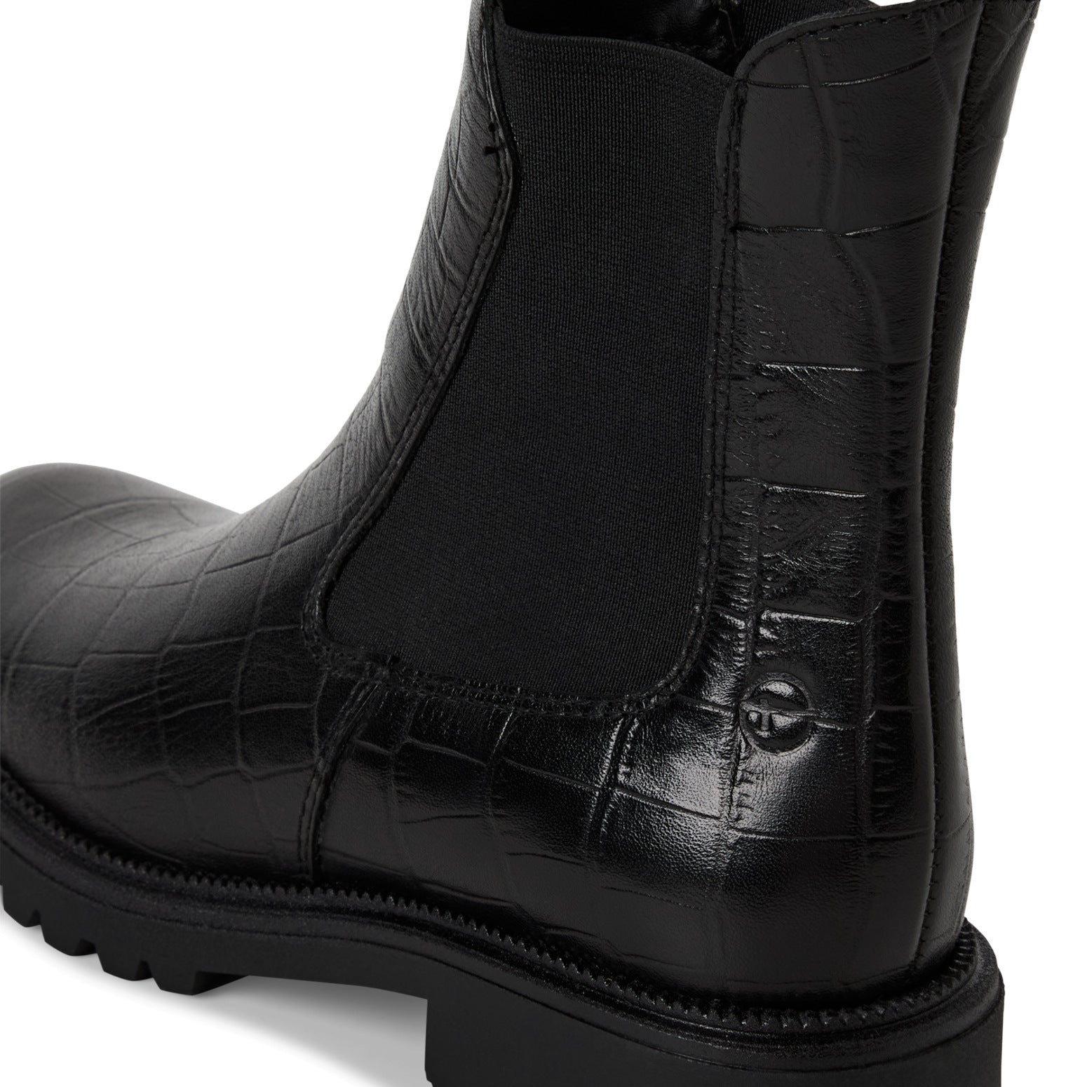 Elegant og moderne Chelsea-støvle i sort krokodillepræget læderlook, der kombinerer stil med komfort. Støvlen har elastiske sider og en praktisk strop bagpå, som gør den nem at tage på. Den kraftige ydersål med groft mønster giver et solidt fodfæste og et råt udtryk, perfekt til både byliv og hverdagsbrug.