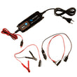 Mulighed for skift af Amp. (0,8 eller 4 Amp.) LED for visning af tilstand. Leveres med DC connector (krokodillenæb og ringkabelsko)